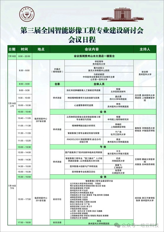 7 月 18 日至 20 日,由贵州医科大学医学影像学院承办的 “第三届全国智能影像工程专业建设研讨会” 在贵阳顺利召开。来自全国高校、医疗机构、科研院所及科技企业的专家学者齐聚一堂,围绕智能影像工程专业的学科建设、技术突破、师资培养三大核心问题展开深度研讨,为推动该领域医工深度融合、高质量发展凝聚智慧共识、共探实践路径。 本次研讨会汇聚了上海健康医学院、牡丹江医科大学、山东第一医科大学、贵州医科大学、聊城大学等15所高校的近50位专家学者。开幕式上,贵州医科大学党委书记汤磊、复旦大学附属中山医院葛均波院士、中华医学会影像技术分会候任主委、山东第一医科大学马新武教授分别致辞,强调智能影像工程专业在医疗科技融合中的重要价值。随后,中国科学院上海药物研究所分子影像中心主任程震、上海健康医学院医学影像学院院长李晓欧、天津医科大学医学技术学院党委书记张雪君等11位来自院校、医院、研究所的专家围绕大会主题作学术讲座,从技术应用到人才培育,全方位拓展了智能影像工程专业建设思路。