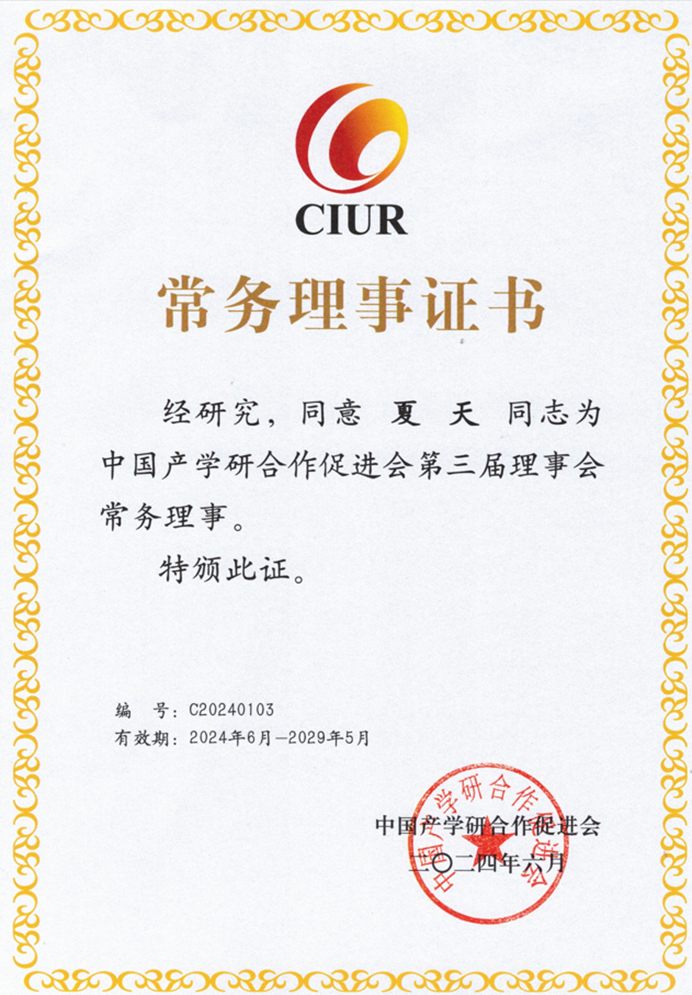 鉴于培云科技前期与各高校开展的产学研合作模式与途径探索,及取得的创新成果,经中国产学研合作促进会考察评估,特吸纳我司为该会常务理事单位,我司执行经理夏天为该会常务理事,有效期均为5年。