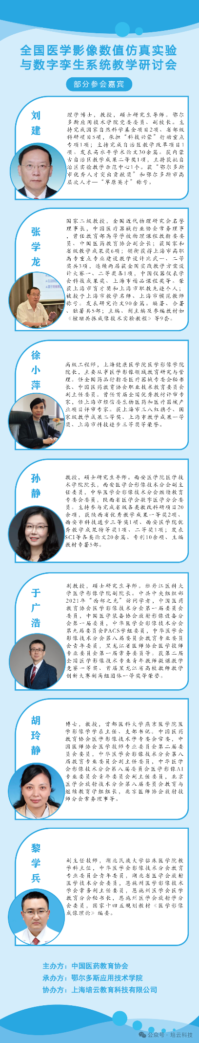 为贯彻落实《国务院办公厅关于加快医学教育创新发展的指导意见》和国家卫生健康委《“十四五”卫生健康人才发展规划》等文件要求,落实国家数字教育方针政策,利用数值仿真与数字孪生技术优势,推进医学影像相关专业教育数字化的转型,进一步提高院校医学影像相关专业建设水平和教学能力,探索新型产教合作模式和医学影像相关专业人才全过程培养新模式,培养一流医学影像相关专业人才。现定于2024年8月15日-8月18日在内蒙古鄂尔多斯市举办“全国医学影像数值仿真实验与数字孪生系统教学研讨会”。欢迎各位专家和老师们莅临指导!