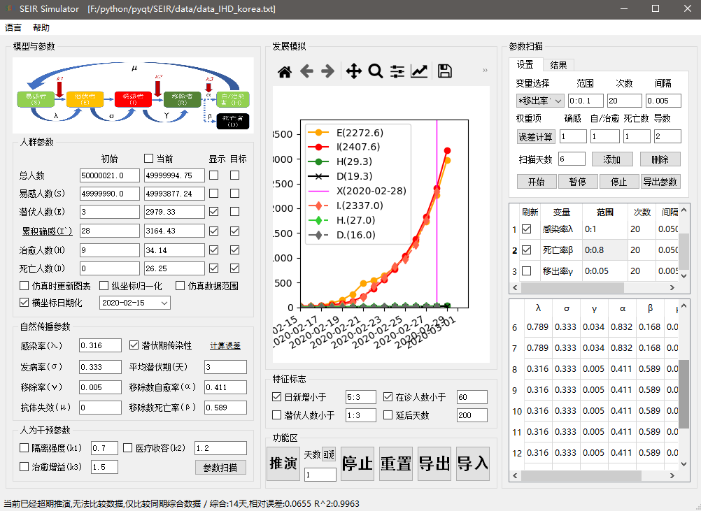 步骤:同以前应用案例,此次疫情参数分两段,目前拟合度0.996