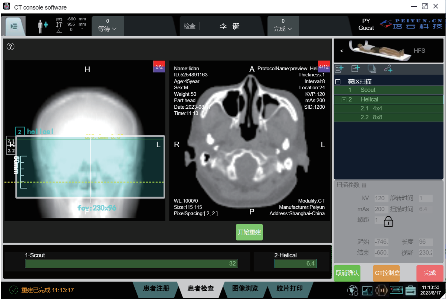 本场景基于真实的CT检查流程所设计,扫描过程根据物理数字人实时计算CT断层图像,实现 了视觉虚拟人与物理数字人的运动关联成像。